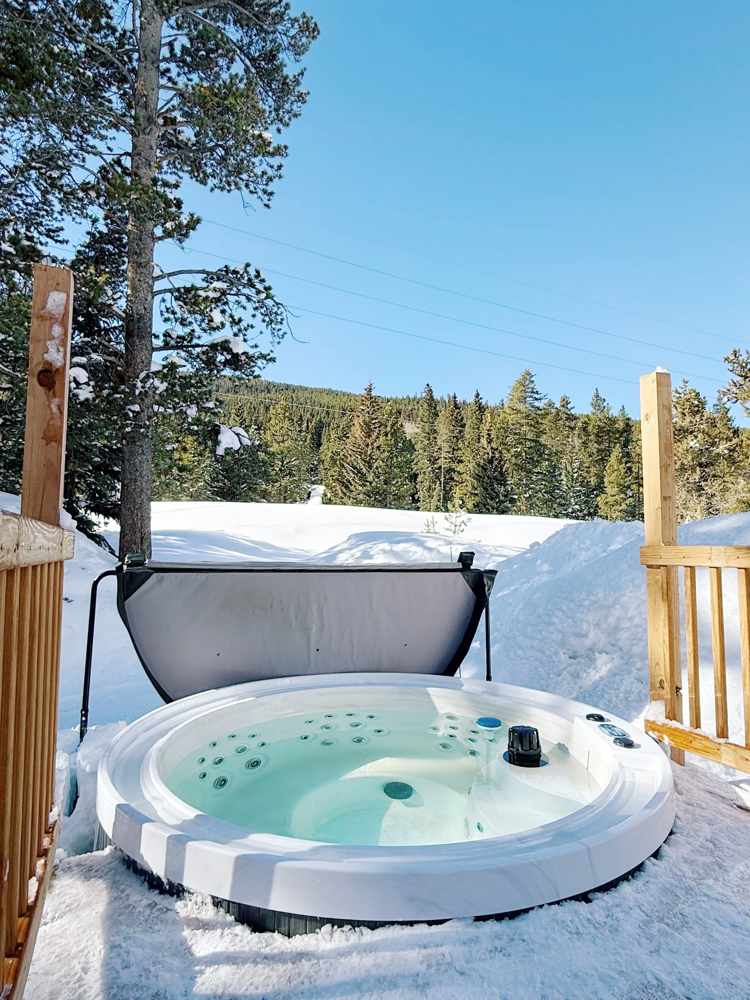Brand new private luxury circular 6 person HOT TUB with ambient cafe string lights for après-adventure relaxation with a mountain backdrop.